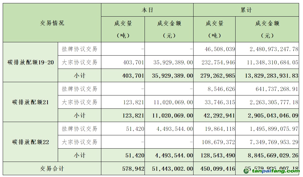 截至今日,全國(guó)碳排放權(quán)交易市場(chǎng)累計(jì)成交總量450,099,416噸,累計(jì)成交總額25,579,996,007.18元。 本@文$內(nèi).容.來(lái).自:中`國(guó)`碳`排*放^交*易^網(wǎng) t a np ai fan g.c om