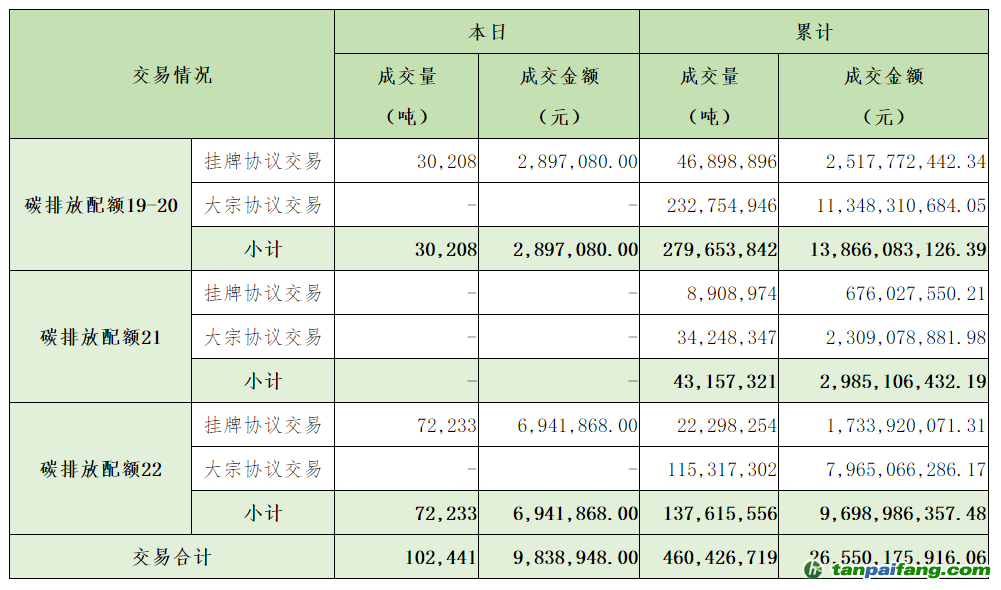截至今日,全國(guó)碳排放權(quán)交易市場(chǎng)累計(jì)成交總量460,426,719噸,累計(jì)成交總額26,550,175,916.06元。