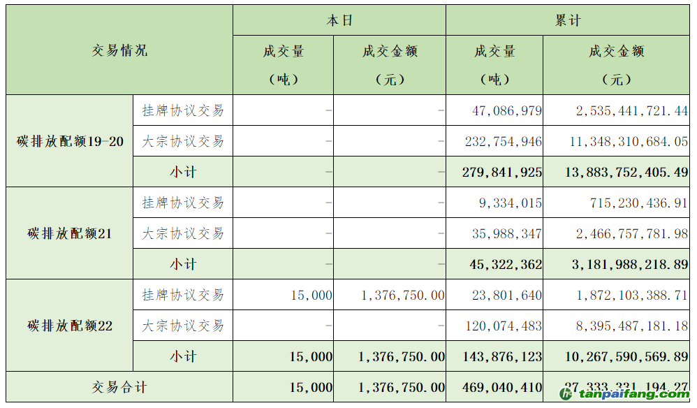 截至今日,全國(guó)碳排放權(quán)交易市場(chǎng)累計(jì)成交總量469,040,410噸,累計(jì)成交總額27,333,331,194.27元。