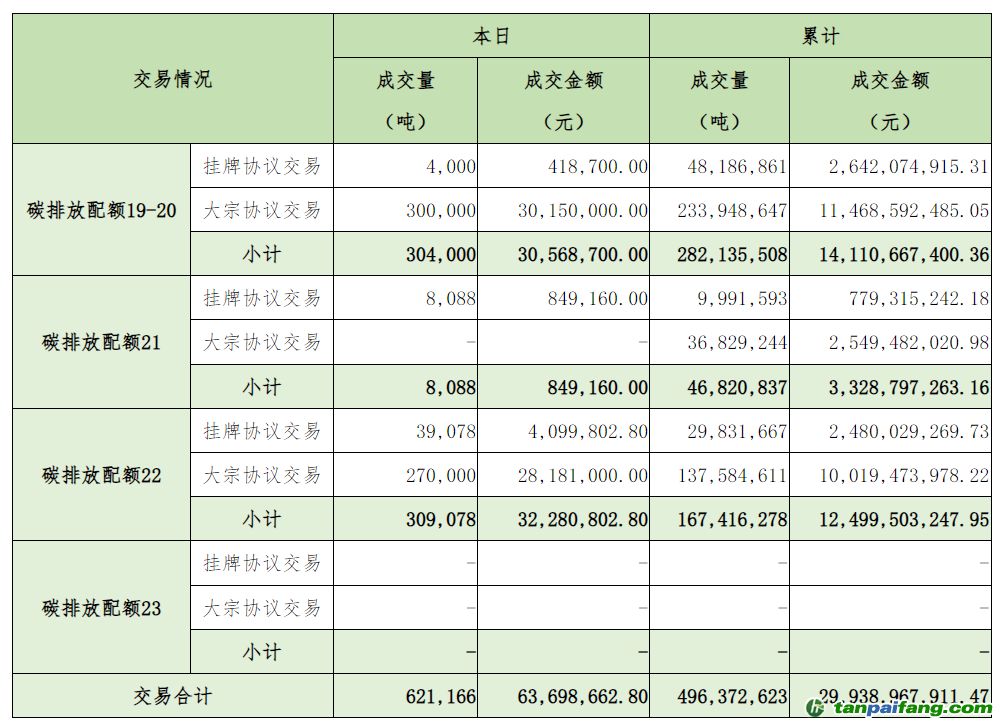 截至今日,全國碳排放權交易市場累計成交總量496,372,623噸,累計成交總額29,938,967,911.47元。 本+文`內/容/來/自:中-國-碳-排-放-網(wǎng)-tan pai fang . com