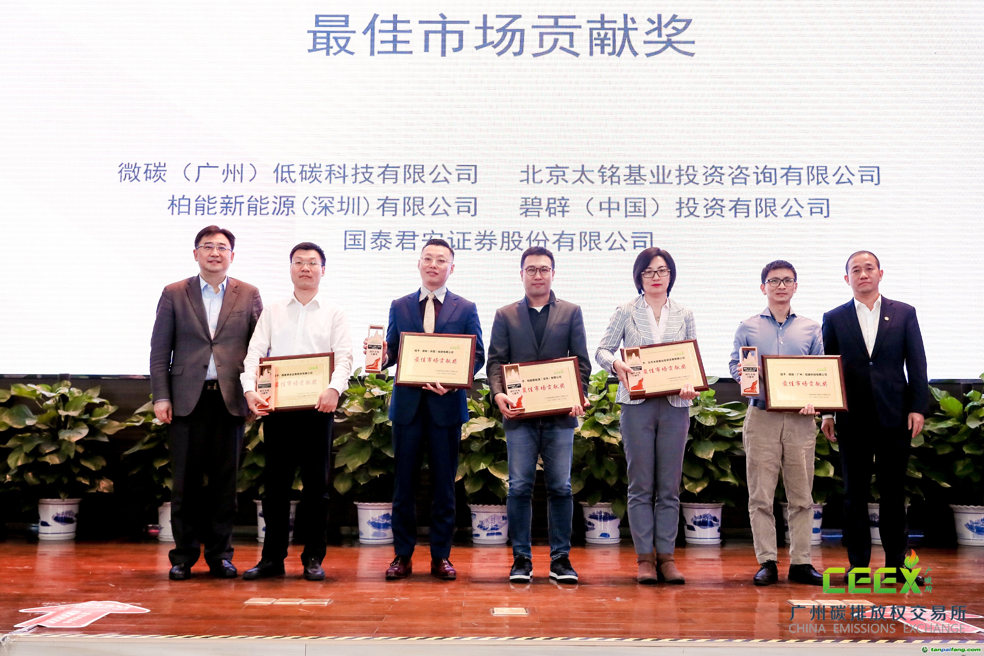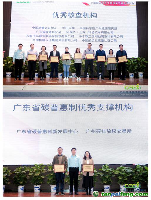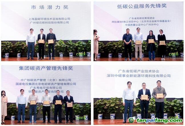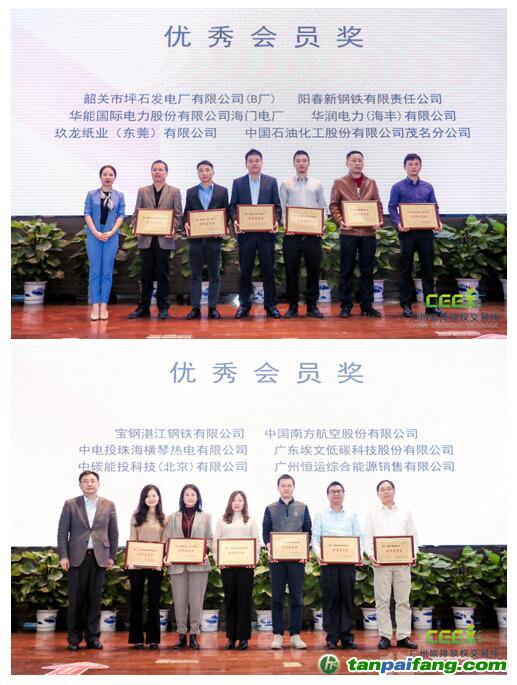 CCER交易績優(yōu)獎”;上海盈碳環(huán)境技術咨詢有限公司、廣州綠石碳科技股份有限公司榮獲“市場潛力獎”;廣東省低碳產(chǎn)業(yè)技術協(xié)會、深圳中碳事業(yè)新能源環(huán)境科技有限公司榮獲“會員開拓先鋒獎”;廣東省低碳發(fā)展促進會、阿拉善SEE珠江項目中心、中國質(zhì)量認證中心榮獲“低碳公益服務先鋒獎”;韶關市坪石發(fā)電廠有限公司(B)廠、陽春新鋼鐵有限責任公司、華能國際電力股份有限公司海門電廠、華潤電力(海豐)有限公司、玖龍紙業(yè)(東莞)有限公司、中國石油化工股份有限公司茂名分公司、寶鋼湛江鋼鐵有限公司、中國南方航空股份有限公司、中電投珠海橫琴熱電有限公司、廣東埃文低碳科技股份有限公司、中碳能投科技有限公司、廣州恒運綜合能源銷售有限公司11家控排單位、5家非控排單位和5名個人會員獲選為廣碳所優(yōu)秀會員。微碳(廣州)低碳科技有限公司、北京太銘基業(yè)投資咨詢有限公司、柏能新能源(深圳)有限公司、國泰君安證券股份有限公司、碧辟(中國)投資有限公司獲頒最佳市場貢獻獎。
