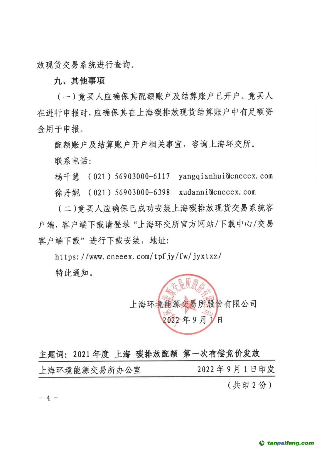 上海環(huán)境能源交易所發(fā)布關(guān)于組織開展2021年度上海碳排放配額有償競價發(fā)放(第一次)的通知。 內(nèi)/容/來/自:中-國-碳-排-放*交…易-網(wǎng)-tan pai fang . com