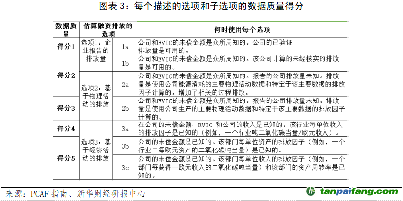 從數(shù)據(jù)質(zhì)量的角度來(lái)看,選項(xiàng)1和2優(yōu)于選項(xiàng)3——它們?yōu)榻鹑跈C(jī)構(gòu)提供更準(zhǔn)確的排放結(jié)果。由于數(shù)據(jù)限制,金融機(jī)構(gòu)可能對(duì)某些公司使用選項(xiàng)1或2,而對(duì)其他公司使用選項(xiàng)3。下表提供了每個(gè)描述的選項(xiàng)和子選項(xiàng)(如果適用)的數(shù)據(jù)質(zhì)量得分,可用于計(jì)算上市股票和公司債券的融資排放。 本%文$內(nèi)-容-來(lái)-自;中_國(guó)_碳|排 放_(tái)交-易^網(wǎng)^t an pa i fang . c om