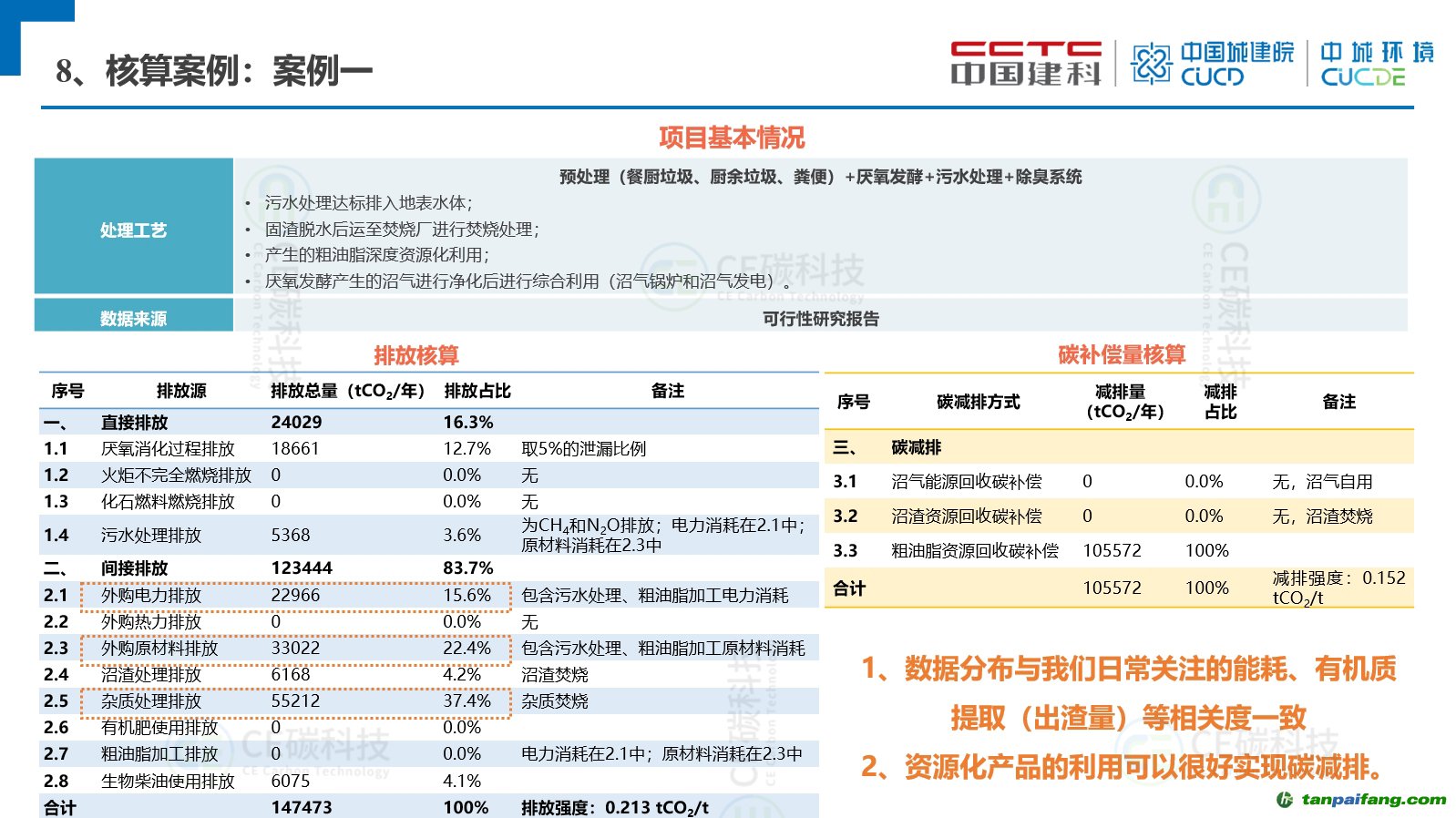 該項目核算邊界條件:①污水處理需滿足地表排放標準,因此其排放標準尤為嚴格;②固渣脫水后運至焚燒廠進行焚燒處理;③粗油脂實現(xiàn)深度資源化利用;④厭氧產(chǎn)生的沼氣在廠內用于發(fā)電或自用。 本`文內.容.來.自:中`國`碳`排*放*交*易^網(wǎng) t a npai fan g.com