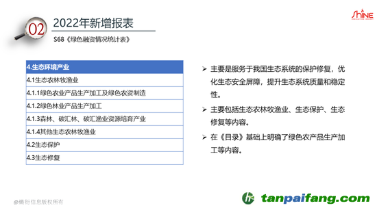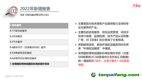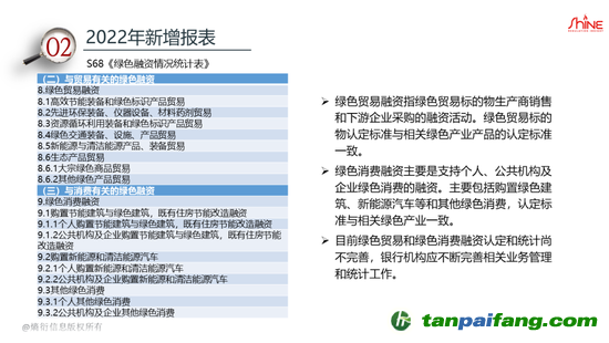 2022年新增S68《綠色融資情況統(tǒng)計(jì)表》,主要指標(biāo)來源于T115報(bào)表,統(tǒng)計(jì)口徑與T115報(bào)表基本一致,但在統(tǒng)計(jì)內(nèi)容上進(jìn)行了縮減,無需統(tǒng)計(jì)綠色信貸節(jié)能減排量數(shù)據(jù),報(bào)表合計(jì)欄目和附錄也做了簡(jiǎn)化。