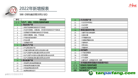 S68之所以叫“綠色融資”,而不叫“綠色信貸”,是因?yàn)樵摫碓诮y(tǒng)計(jì)表內(nèi)綠色信貸余額的基礎(chǔ)上,增加了【非金融企業(yè)綠色債券投資余額】、【綠色銀行承兌匯票】和【綠色信用證】統(tǒng)計(jì)列。根據(jù)相關(guān)度,“綠色”指標(biāo)分為[(一)與生產(chǎn)、建設(shè)、經(jīng)營(yíng)有關(guān)的綠色融資]、[(二)與貿(mào)易有關(guān)的綠色融資]、[(三)與消費(fèi)有關(guān)的綠色融資],合計(jì)項(xiàng)為[(四)綠色融資合計(jì)]。此外還包括[(五)附錄、環(huán)境權(quán)益融資]。