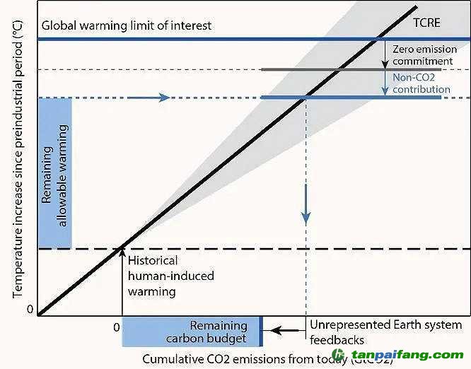 圖片來源:Rogelj et al. (2019) [8] - 全球碳預(yù)算余量、瞬變氣候響應(yīng)(TCRE)與迄今累計碳排放量關(guān)系示意圖 內(nèi)-容-來-自;中_國_碳_0排放¥交-易=網(wǎng) t an pa i fa ng . c om