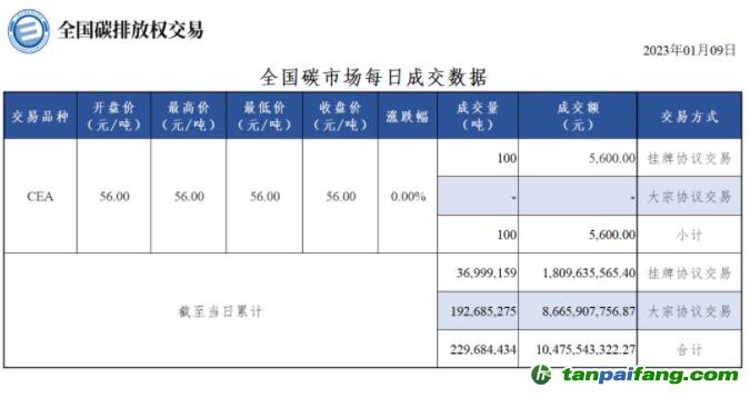 截至今日,全國(guó)碳市場(chǎng)碳排放配額(CEA)累計(jì)成交量229,684,434噸,累計(jì)成交額10,475,543,322.27元。