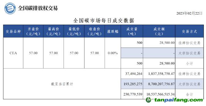 截至今日,全國碳市場碳排放配額(CEA)累計成交量230,779,539噸,累計成交額10,537,566,515.34元。