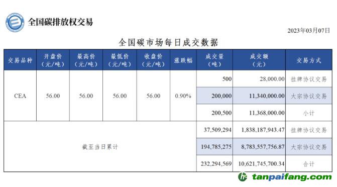 截至今日,全國碳市場碳排放配額(CEA)累計成交量232,294,569噸,累計成交額10,621,745,700.34元。
