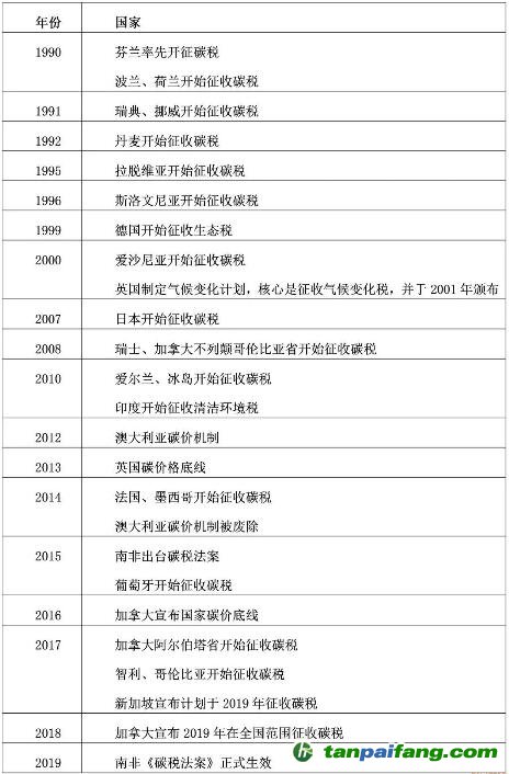 碳稅的國家。1990年,芬蘭政府對化石燃料按碳含量征收1.62美元/tCO2的碳稅,而后芬蘭在1997年和2011年分別進行了稅制改革,納入更多征稅對象以及采用更科學(xué)的征稅方法。目前包括加拿大、澳大利亞、英國、美國等20多個國家均有實施碳稅。各國開始征收碳稅的時間如下表所示: