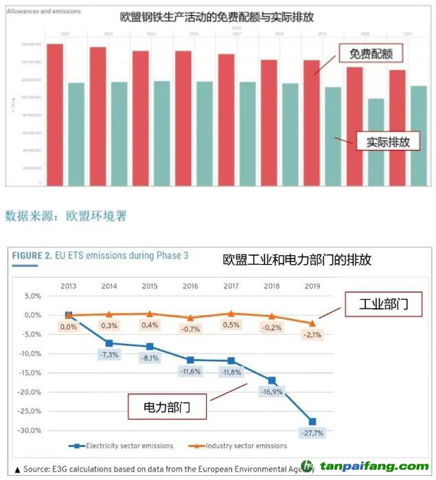 價(jià)格信號(hào)和刺激減排的功用,是歐盟工業(yè)脫碳的負(fù)動(dòng)力。相比之下,歐盟的電力部門(mén)自2013年取消免費(fèi)配額以來(lái),減碳成效顯著。當(dāng)然,電力部門(mén)減碳相對(duì)簡(jiǎn)單,不可完全歸功于取消免費(fèi)配額。