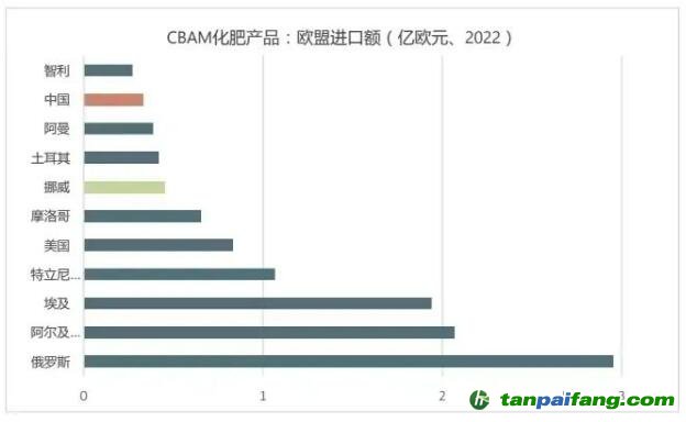 2022年,以貿(mào)易額計,歐盟進(jìn)口的“CBAM化肥產(chǎn)品”主要來自:俄羅斯、阿爾及利亞、埃及、特立尼達(dá)和多巴哥、美國、摩洛哥、挪威、土耳其、阿曼、中國和智利。在上述11個國家中,挪威因豁免于CBAM應(yīng)予排除,剩下的就是歐盟進(jìn)口“CBAM化肥產(chǎn)品”的十大來源。中國排名第九,為3.3億歐元,占?xì)W盟從中國進(jìn)口總額的0.05%。