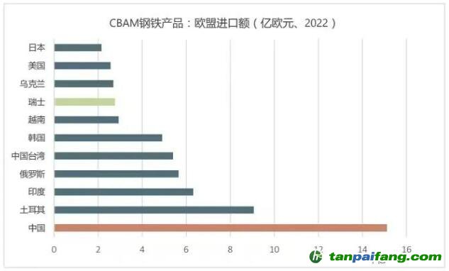 2022年,以貿(mào)易額計,歐盟進(jìn)口的“CBAM鋼鐵產(chǎn)品”主要來自:中國、土耳其、印度、俄羅斯、中國臺灣、韓國、越南、瑞士、烏克蘭、美國和日本。在上述11個國家和地區(qū)中,瑞士因豁免于CBAM應(yīng)予排除,剩下的就是歐盟進(jìn)口 “CBAM鋼鐵產(chǎn)品”的十大來源。中國排名第一,為151億歐元,占?xì)W盟從中國進(jìn)口總額的2.4%。