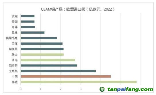 2022年,以貿(mào)易額計,歐盟進(jìn)口的“CBAM鋁產(chǎn)品”主要來自:挪威、中國、土耳其、俄羅斯、冰島、瑞士、阿聯(lián)酋、印度、莫桑比克、巴林、南非、美國和波黑。在上述13個國家中,挪威、瑞士和冰島因豁免于CBAM應(yīng)予排除,剩下的就是歐盟進(jìn)口“CBAM鋁產(chǎn)品”的十大來源。中國仍然排名第一,為45億歐元,占?xì)W盟從中國進(jìn)口總額的0.7%。