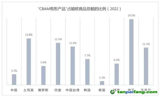 雖然199.6億歐元這一絕對數(shù)字不小,但也應(yīng)注意到2022年歐盟從中國進(jìn)口的商品總額為6,260億歐元,其中“CBAM有形產(chǎn)品”占比僅為3.2%。這個比例在排名前十的國家和地區(qū)中是第二低,略高于美國 (1.1%) ,遠(yuǎn)低于埃及 (19.5%) 、土耳其 (13.8%) 和印度 (12.5%) 。這說明中國對歐出口的主力并非CBAM所覆蓋的初級原材料產(chǎn)品及其直接衍生品 (如鋼管、螺絲和鋁結(jié)構(gòu)件) 。