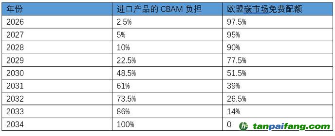 表1 全面實施CBAM前分年度CBAM負(fù)擔(dān)及免費配額