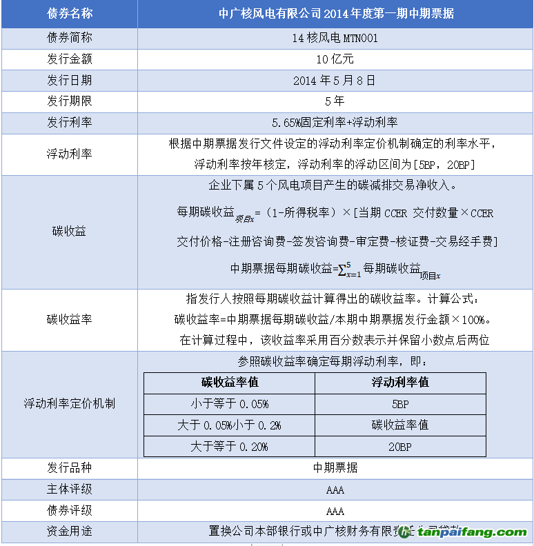 中廣核風(fēng)電附加碳收益中期票據(jù)特別創(chuàng)新了“固定利率+浮動利率”的利率結(jié)構(gòu),其中固定利率為5.65%,較同期限AAA級信用債低約46BP;浮動利率區(qū)間設(shè)定為5BP至20BP,與發(fā)行人下屬的5家風(fēng)電項目公司在債券存續(xù)期實(shí)現(xiàn)的