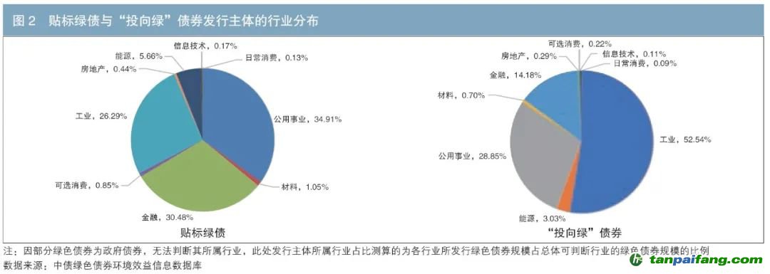 從發(fā)行主體的行業(yè)分布來看,貼標(biāo)綠債和“投向綠”債券均主要集中于公用事業(yè)、金融、工業(yè)等行業(yè)(見下表)。