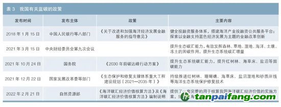 我國積極開展藍(lán)碳保護(hù)和藍(lán)碳經(jīng)濟(jì)發(fā)展工作,在藍(lán)碳研究保護(hù)、海洋碳匯標(biāo)準(zhǔn)制定和藍(lán)碳金融發(fā)展方面均出臺了相關(guān)支持政策(見表3)。 夲呅內(nèi)傛萊源?。骇鎲┨?排*放^鮫*易-網(wǎng) τā ńpāīfāńɡ.cōm