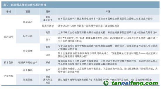 為推動藍(lán)碳發(fā)展,國際上主要采取了政府引導(dǎo)、技術(shù)創(chuàng)新、產(chǎn)業(yè)升級三方面舉措,具體情況如表2所示。