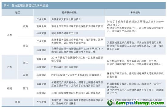 近年來,山東省、廣東省、福建省、海南省這幾個海洋資源較豐富的地區(qū)發(fā)力藍(lán)碳領(lǐng)域,大力發(fā)展海藻床修復(fù)、紅樹林系統(tǒng)保護(hù)、海上牧場等產(chǎn)業(yè)豐富藍(lán)碳資源,同時依托當(dāng)?shù)氐母咝:脱芯克?,完善藍(lán)碳相關(guān)產(chǎn)業(yè)的碳匯標(biāo)準(zhǔn)。其中,部分地區(qū)已經(jīng)開展了藍(lán)碳金融實踐。威海市落地了全國首單海洋碳匯指數(shù)保險和海洋碳匯信貸;湛江市開發(fā)了全國首個以紅樹林為主體的藍(lán)碳碳匯項目;廈門市搭建了全國首個海洋碳匯交易服務(wù)平臺并完成多筆碳匯交易。但總體來看,藍(lán)碳交易仍然處于發(fā)展初步階段(見表4)。未來山東省、廣東省、福建省、海南省都將深耕藍(lán)碳金融領(lǐng)域,從頂層設(shè)計、平臺搭建和項目開發(fā)等方面爭奪藍(lán)碳金融發(fā)展的制高點。 本+文`內(nèi)/容/來/自:中-國-碳-排-放-網(wǎng)-tan pai fang . com