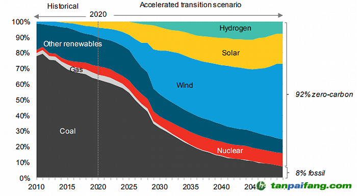 加速轉(zhuǎn)型情景是在經(jīng)濟(jì)轉(zhuǎn)型情景結(jié)果的基礎(chǔ)上提出。在這一情景中,2023年后中國公路運(yùn)輸、建筑和工業(yè)領(lǐng)域的直接電氣化程度提高,且零碳電力供應(yīng)更為普及,將會(huì)構(gòu)建氣規(guī)模更大、更清潔化的電力系統(tǒng)。 禸*嫆唻@洎:狆國湠棑倣茭昜蛧 τāńpāīfāńɡ.cōm