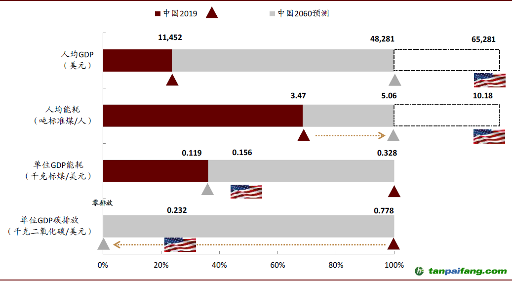 圖表: 人均GDP,單位GDP排放,單位GDP能耗 (中國(guó)2019/2060 vs.對(duì)標(biāo)美國(guó)2019) 本*文`內(nèi)/容/來(lái)/自:中-國(guó)-碳^排-放“交|易^網(wǎng)-tan pai fang . c o m