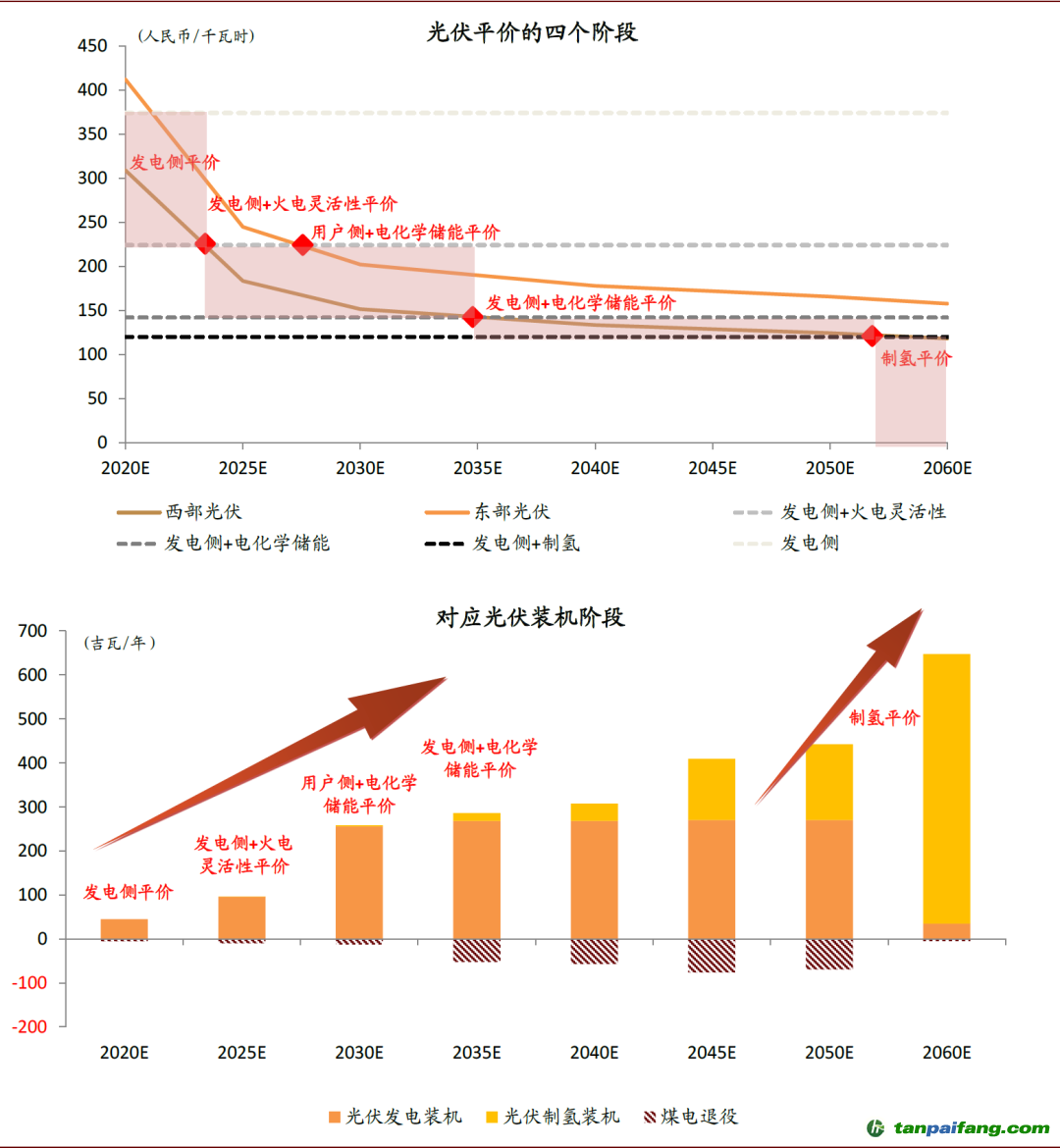 ?第四階段(2050+):光伏制氫平價(jià)打開(kāi)新的裝機(jī)空間。2050年以后,光伏度電成本降到0.12元/度左右的水平,實(shí)現(xiàn)氫能在工業(yè)領(lǐng)域較傳統(tǒng)能源的平價(jià),打開(kāi)非電領(lǐng)域碳中和、氫能替代、以及可再生能源裝機(jī)的新機(jī)遇??紤]電氣化率的極限,我們預(yù)期2050年后仍有1/3的能源消費(fèi)沒(méi)有電氣化,這部分需要綠氫替代,因此帶來(lái)的新能源裝機(jī)需求和發(fā)電側(cè)的裝機(jī)在一個(gè)數(shù)量級(jí),是具備爆發(fā)潛力、可能超預(yù)期的一個(gè)市場(chǎng)。 禸*嫆唻@洎:狆國(guó)湠棑倣茭昜蛧 τāńpāīfāńɡ.cōm