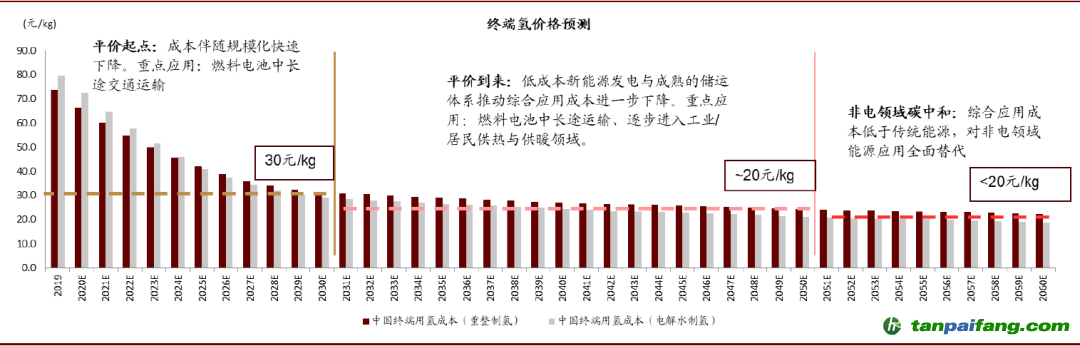 2031E-2050E:步入平價(jià),應(yīng)用領(lǐng)域拓寬,供給與應(yīng)用規(guī)模大幅提升。我們認(rèn)為,在這一階段,氫能源的成本受益于富電區(qū)域新能源發(fā)電的低電價(jià),與逐步完備的中長(zhǎng)距離運(yùn)輸/管路,使得加氫成本逐步下降至近20元/kg。同時(shí)新能源電解水制氫也將逐步成為氫能供給的主流模式。對(duì)于燃料電池車(chē)輛,當(dāng)不考慮柴油針對(duì)碳排成本上升時(shí),氫成本下降至20元/kg可直接與柴油平價(jià)。此外,此階段的非交通領(lǐng)域用氫的價(jià)格已逐步下降至18-20元/kg(即不考慮加氫站的加注成本),在工業(yè)與家庭供暖領(lǐng)域已逐步具備一定經(jīng)濟(jì)性基礎(chǔ),我們認(rèn)為通過(guò)初期與天然氣的混合使用,以及伴隨氫價(jià)格的進(jìn)一步下降,在供暖領(lǐng)域,氫能也將逐步提升應(yīng)用滲透率。