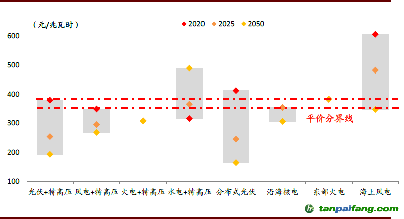 圖表: 各電源度電成本橫向比較2020~2050,東部區(qū)域(考慮西部電力特高壓外送)