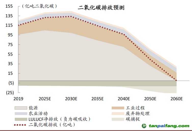 ?我們預(yù)計(jì)隨著十四五開(kāi)始執(zhí)行碳中和目標(biāo),中國(guó)將在2028年達(dá)到碳排放峰值在134億噸二氧化碳,較現(xiàn)在的115億噸上升16%。而之后中國(guó)將通過(guò)電力領(lǐng)域提升非化石能源比例完成電力碳中和,非電領(lǐng)域先推動(dòng)天然氣替代再推動(dòng)氫能替代完成能源碳中和,并在需求端通過(guò)碳排放權(quán)總量控制+交易的形式推動(dòng)新技術(shù)在工業(yè)和交通等領(lǐng)域的應(yīng)用、加速碳中和進(jìn)程,從高碳向低碳最后向零碳三步走,完成2060年對(duì)能源,工業(yè)和農(nóng)業(yè)領(lǐng)域的碳中和。 內(nèi).容.來(lái).自:中`國(guó)*碳-排*放*交*易^網(wǎng) t a npai fa ng.com