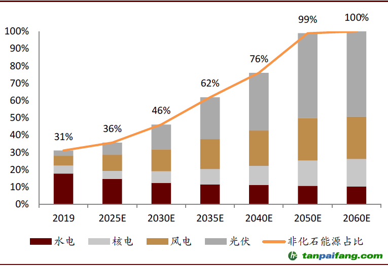 ?非電碳中和:還是有很多領(lǐng)域的能源需求無(wú)法通過(guò)電來(lái)替代,不僅僅是電力的成本問(wèn)題,也是其利用能源的形式所致。比如在交通長(zhǎng)距離領(lǐng)域能源使用難以通過(guò)電能實(shí)現(xiàn),化工,金屬&非金屬冶煉等行業(yè)需要通過(guò)燃燒能源的使用形式也難以被電能滿足。我們預(yù)計(jì)在2060年能源中30%的能源消費(fèi)將以非電的形式存在,因此能源碳中和的最后一步將需要由氫能或者碳捕捉完成。 本%文$內(nèi)-容-來(lái)-自;中_國(guó)_碳|排 放_(tái)交-易^網(wǎng)^t an pa i fang . c om