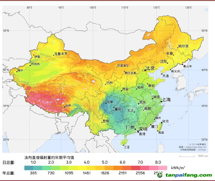 圖表: 中國(guó)太陽(yáng)能輻照資源圖(2019) 本文@內(nèi)/容/來(lái)/自:中-國(guó)-碳^排-放-交易&*網(wǎng)-tan pai fang . com