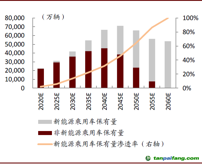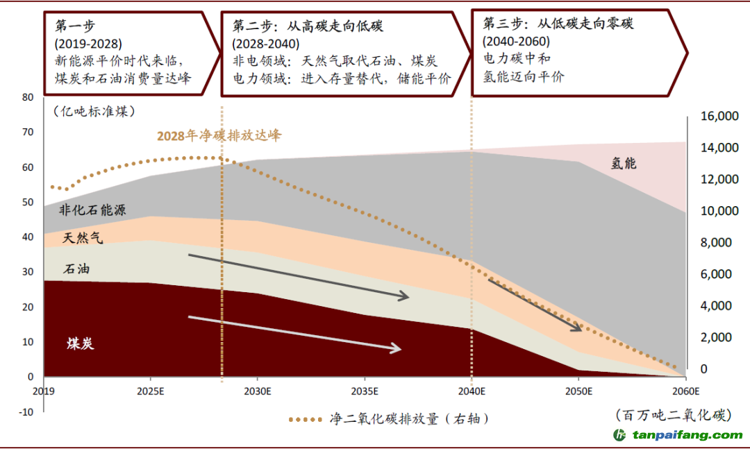 ?我們認(rèn)為未來(lái)中國(guó)的能源發(fā)展將會(huì)經(jīng)歷從高碳到低碳到零碳的過(guò)程,分別是現(xiàn)在至2028年新能源平價(jià)時(shí)代來(lái)臨,煤炭、石油消費(fèi)量達(dá)峰,碳排放在2028年達(dá)峰;2028-2040年非電領(lǐng)域通過(guò)天然氣代替石油煤炭降低碳排放,在電力領(lǐng)域新能源從增量替代逐漸開(kāi)始存量替代,分別完成用戶端儲(chǔ)能+新能源和發(fā)電端儲(chǔ)能+新能源平價(jià),中國(guó)碳排放從高碳走向低碳;2040-2060年隨著發(fā)電成本進(jìn)一步降低、氫能邁向平價(jià),完成能源碳中和。 內(nèi)/容/來(lái)/自:中-國(guó)-碳-排-放*交…易-網(wǎng)-tan pai fang . com