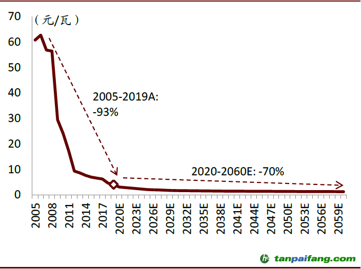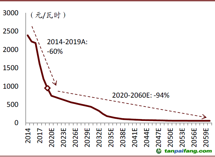 ?第三階段(2035~2050):發(fā)電側(cè)+電化學(xué)儲(chǔ)能全面平價(jià)。這一階段,可再生能源滲透率提升+火電機(jī)組到期退役,而光伏+儲(chǔ)能成本繼續(xù)下降至發(fā)電側(cè)平價(jià)空間完全打開(kāi),光伏扔掉拐杖成為主力電源?;诖?,我們2060年的電力結(jié)構(gòu)預(yù)測(cè)光伏多于風(fēng)電,而非落在多能互補(bǔ)的最優(yōu)配比,本質(zhì)是光伏降本的更大潛力,使得光儲(chǔ)達(dá)到完全平價(jià)條件。