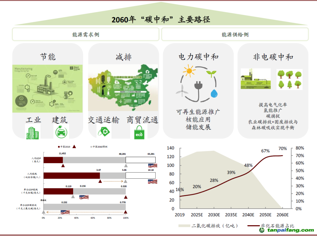 我們認(rèn)為中國(guó)要達(dá)成2060年“碳中和”的目標(biāo),需要從能源需求側(cè)和供給側(cè)兩方面進(jìn)行: 本@文$內(nèi).容.來(lái).自:中`國(guó)`碳`排*放^交*易^網(wǎng) t a np ai fan g.c om