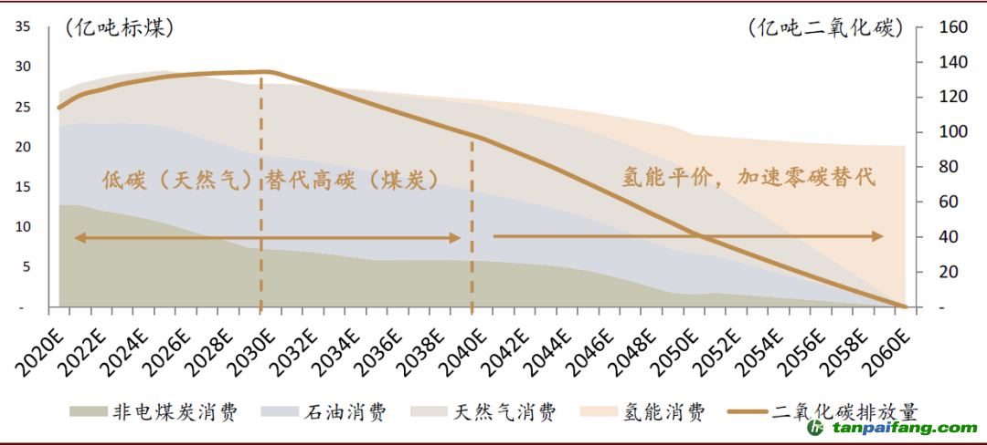 ?非化石能源+氫能逐步形成傳統(tǒng)能源替代,在不增加碳排放的情況下支撐能源消費(fèi)上行。我們認(rèn)為要達(dá)到最終“碳中和”目標(biāo),可預(yù)見(jiàn)的電能使用比例不斷提升,各行業(yè)都最大范圍實(shí)現(xiàn)電氣化,并且電能逐步由非化石能源滿足。化石能源方面,2025-2028年間,煤炭、石油消費(fèi)量占比從2025年46.9%和21.1%,分別下滑至42.3%和19.7%,而天然氣將從12.0%小幅上升至13.5%。此外,我們認(rèn)為2035-40年氫能將起步,并在2040年后開(kāi)始逐步邁向平價(jià),與非化石能源電力一起形成對(duì)傳統(tǒng)能源的替代,并帶來(lái)天然氣消費(fèi)于2049年達(dá)峰后回落,由氫能支撐能源消費(fèi)增長(zhǎng)、同時(shí)不產(chǎn)生二氧化碳。隨著煤炭、石油消費(fèi)在2028年達(dá)峰,排放總量將同時(shí)實(shí)現(xiàn)峰值,并在2060年非化石能源和氫能全面取代后,達(dá)成零排放。