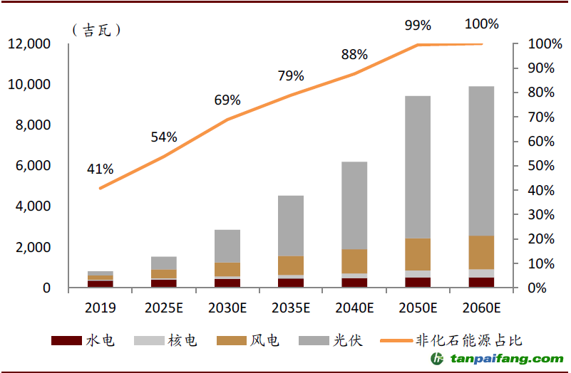 在電力碳中和的目標(biāo)下,我們預(yù)計(jì)2025、2030、2035、2060年非化石能源電力裝機(jī)將分別達(dá)到1,527、2,856、4,524、9,898吉瓦,占到全部電力裝機(jī)的54%、69%、79%、100%。其中十四五期間光伏、風(fēng)電年均新增裝機(jī)分別達(dá)到74吉瓦和40吉瓦。發(fā)電量方面,隨著裝機(jī)量提升、傳統(tǒng)能源退役,我們預(yù)計(jì)2060年非化石能源將貢獻(xiàn)全部電量。 本+文+內(nèi)/容/來(lái)/自:中-國(guó)-碳-排-放(交—易^網(wǎng)-tan pai fang . com