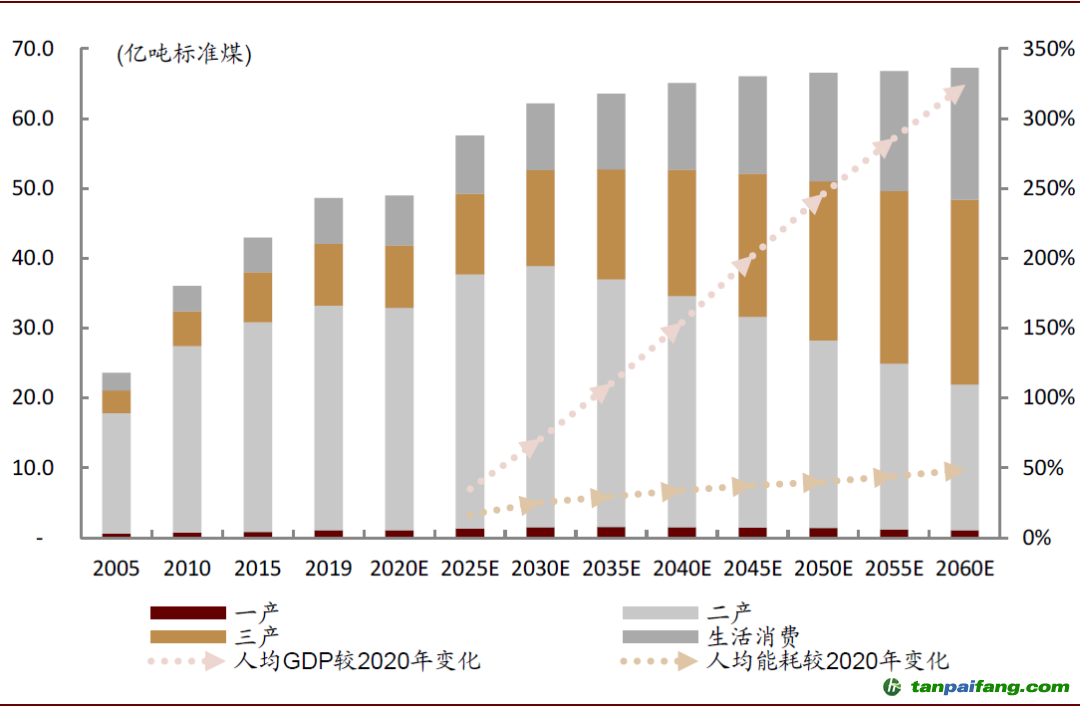 ? 預(yù)計(jì)能源消費(fèi)總量或在2060年達(dá)到67.3億噸標(biāo)準(zhǔn)煤(總量較當(dāng)前上行38%),增速逐步放緩。我們預(yù)測(cè)我國(guó)的能源消費(fèi)總量將在2025/2035/2060年分別達(dá)到57.6/63.6/67.3億噸標(biāo)準(zhǔn)煤,總體保持連年同比增長(zhǎng)。但隨著單位GDP能耗較低的三產(chǎn)比重不斷擴(kuò)大,能源消費(fèi)增速將呈現(xiàn)放緩走勢(shì)。 本+文內(nèi).容.來(lái).自:中`國(guó)`碳`排*放*交*易^網(wǎng) ta np ai fan g.com