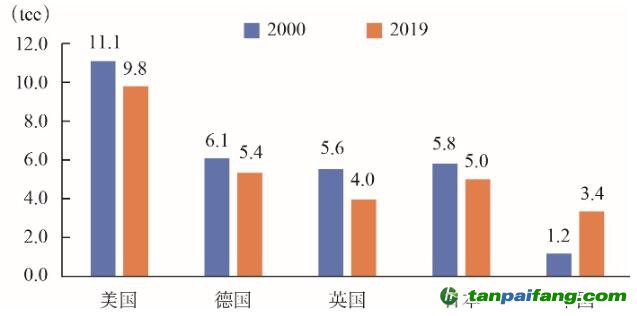 值得關(guān)注的是,20世紀(jì)90年代以來,隨著全球氣候變化問題提上日程,發(fā)達國家紛紛意識到只有降低能源消費,才能減少二氧化碳排放,同時為加快化石能源替代創(chuàng)造條件。美國、德國、英國、日本等發(fā)達國家紛紛加大對節(jié)能和提高能效的重視,采取措施努力降低本國能源消費。經(jīng)過近20年的努力,美國的人均能源消費量從2000年的11.1?tce下降到2019年的9.8?tce,下降11.9%;德國從2000年的6.1?tce下降到2019年的5.4?tce,下降12%;英國人均能源消費量從2000年的5.6?tce下降到2019年的4.0?tce,下降29%;日本從2000年的5.8?tce下降到2019年的5.0?tce,下降14%。人均能源消費量和本國能源消費總量的下降,為這些國家減排二氧化碳做出了重要貢獻。圖2 2000年與2019年中國和典型發(fā)達國家人均能源消費量 來源:BP能源統(tǒng)計。