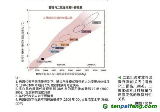 人類為什么要應對氣候變化呢?當前科學共同體研明,溫室氣體排放會導致全球溫度升高并觸發(fā)氣候災難,比如干旱、颶風等,一些百年一遇的災難可能會變成十年一遇,這是人類難以承受的。為了把溫度控制在有限的升高范圍之內,人類就要控制溫室氣體的排放量。那么二氧化碳的排放量和溫度升高是一個什么樣的關系呢?通過研究,科學家發(fā)現(xiàn)二氧化碳以及其他溫室氣體的累積排放與溫度升高之間大致呈線性關系的。