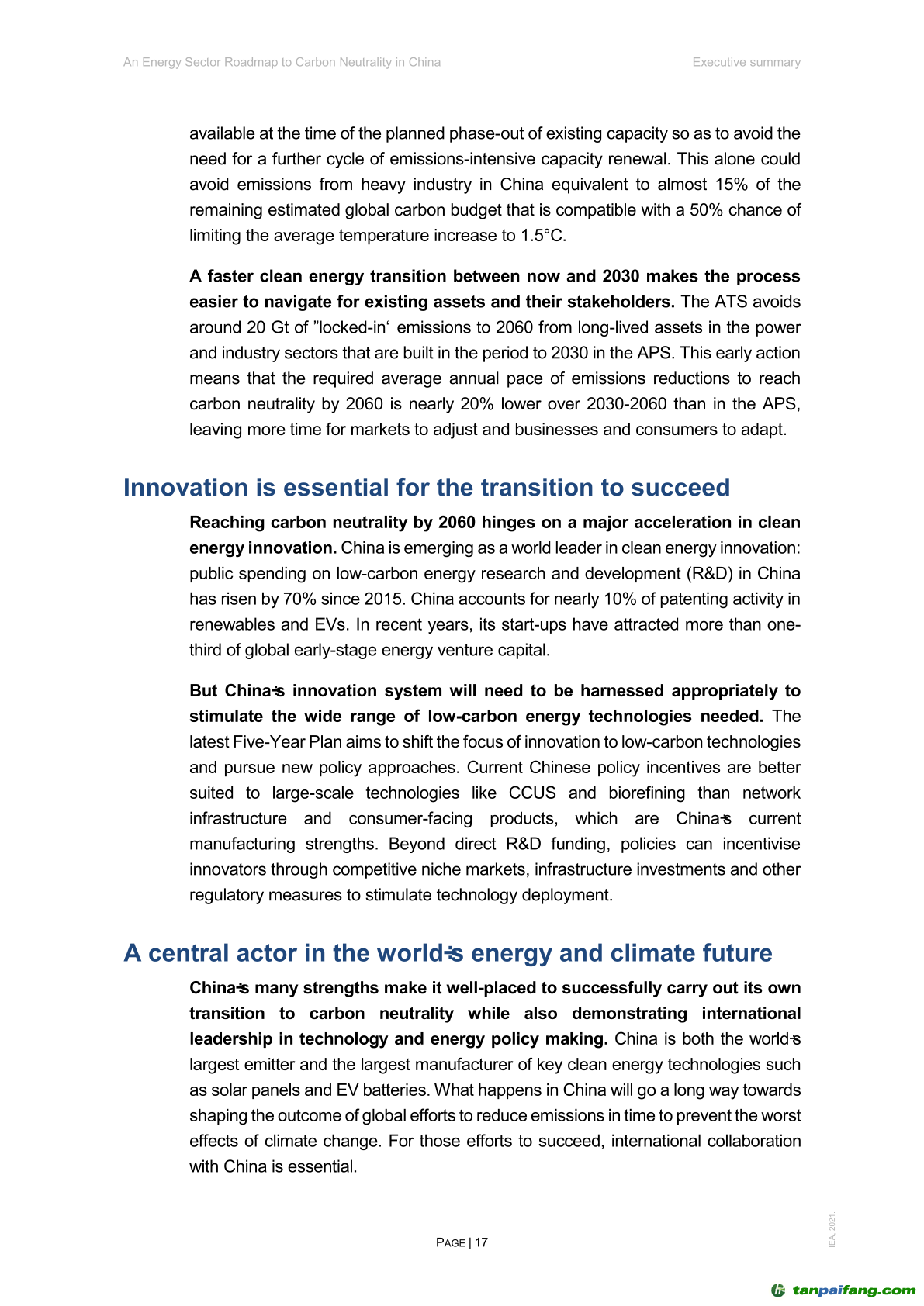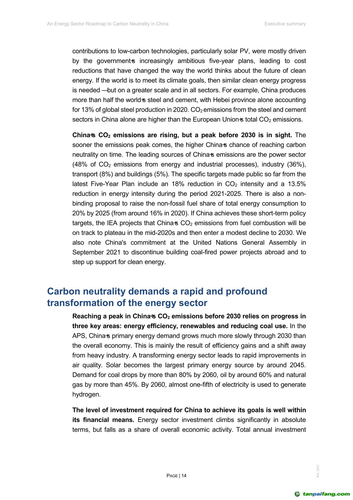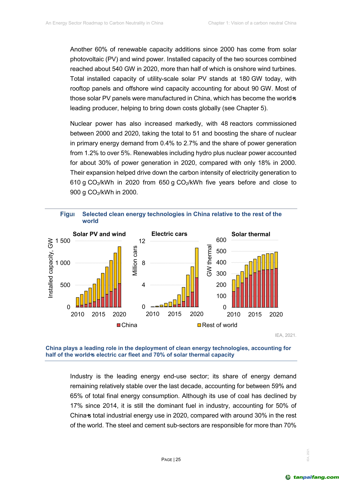 國際能源署署長法提赫 · 比羅爾博士說:“中國是清潔能源發(fā)展的主力軍,從太陽能發(fā)電到電動(dòng)汽車,中國在現(xiàn)有的許多成功案例中都發(fā)揮了主導(dǎo)作用。中國為實(shí)現(xiàn)其碳中和目標(biāo)所做的努力將會促進(jìn)更廣泛的低碳技術(shù)蓬勃發(fā)展,并在未來幾十年內(nèi)推動(dòng)大幅削減使用化石燃料。 夲呅內(nèi)傛萊源亍:ф啯碳*排*放^鮫*易-網(wǎng) τā ńpāīfāńɡ.cōm