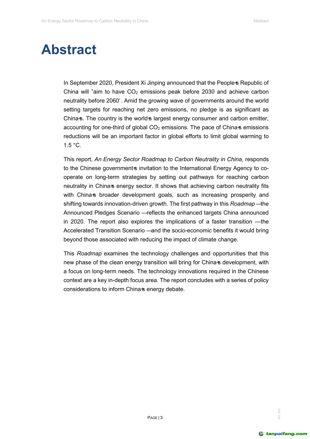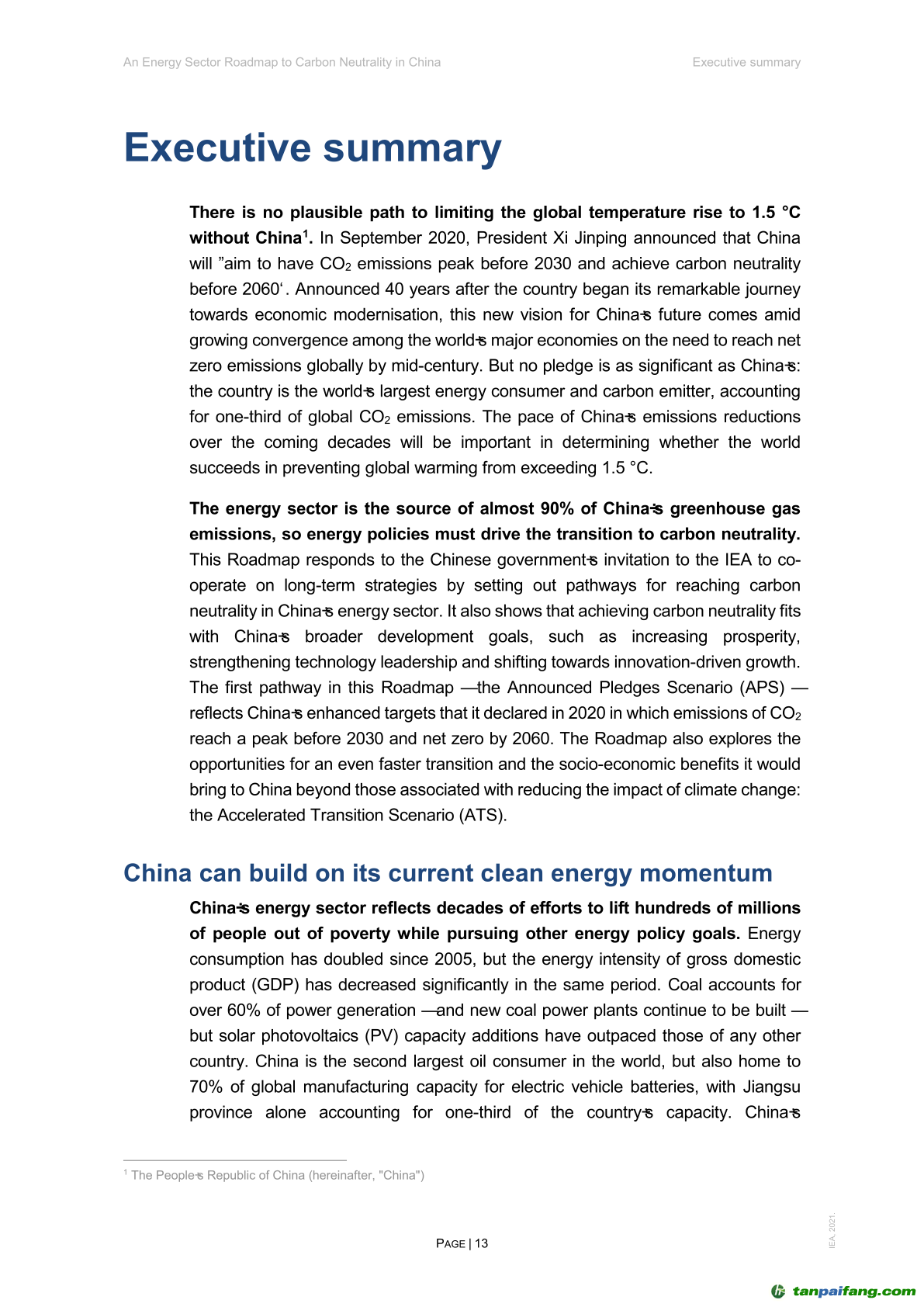 中國計(jì)劃于 2030 年前達(dá)到二氧化碳排放峰值,于 2060 年前實(shí)現(xiàn)碳中和。能源體系是中國近 90% 的溫室氣體排放源,因此能源政策成為中國碳中和轉(zhuǎn)型的核心。國際能源署今日發(fā)布的最新報(bào)告 ——《中國能源體系碳中和路線圖》—— 探討了中國將如何實(shí)現(xiàn)其低碳目標(biāo)同時(shí)保證能源安全及人民的承受能力。報(bào)告表明基于中國經(jīng)濟(jì)的規(guī)模和活力,實(shí)現(xiàn)碳中和所需的投資完全在中國能力范圍之內(nèi)。本報(bào)告是對中國政府邀請國際能源署在長期政策戰(zhàn)略方面進(jìn)行合作的回應(yīng)。