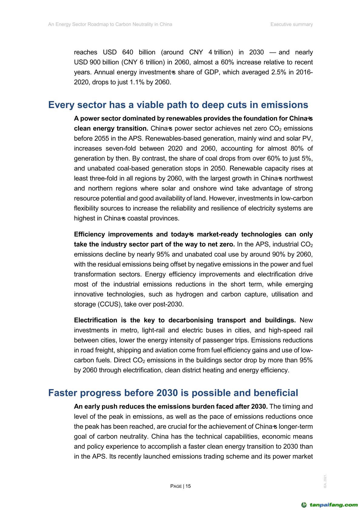“但是,真正令人振奮的消息是,我們的路線圖顯示,中國有辦法和能力實(shí)現(xiàn)更快速的清潔能源轉(zhuǎn)型,這將為中國人民帶來更大的社會和經(jīng)濟(jì)福利,同時(shí)也提高了世界將全球氣溫上升限制在 1.5℃的機(jī)會,” 比羅爾博士補(bǔ)充,“這種加速轉(zhuǎn)型將使中國的二氧化碳排放量在 2025 年后明顯下降,為中國在遠(yuǎn)早于 2060 年就實(shí)現(xiàn)碳中和提供了可能性。這對中國、對世界都有益處。” 本文@內(nèi)/容/來/自:中-國-碳^排-放-交易&*網(wǎng)-tan pai fang . com