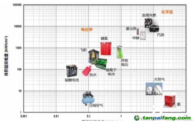 第一,氫氣體積能量密度小。如果論重量,氫能量密度是最大的。對(duì)于汽車來(lái)說(shuō),更應(yīng)該論體積。如果轉(zhuǎn)成同樣的能源概念,氫的體積能量密度是最小的(如下圖)。為了增加體積能量密度,只好增加壓力;