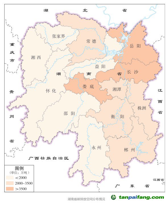 湖南省碳排放量總體呈現(xiàn)東高西低特點,其中長沙、婁底、岳陽碳排放量高于3500萬噸;婁底、湘潭碳排放強度最高,高于1.0噸/萬元,長沙、永州碳排放強度最低,低于0.5噸/萬元。