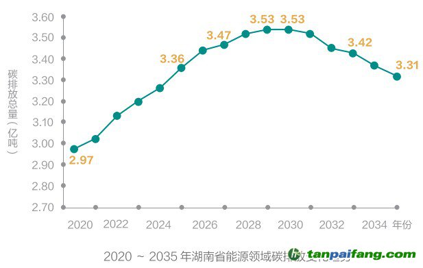 《報告》認為,目前湖南省人均碳排放處于較低水平,處于工業(yè)化中后期階段,碳排放總量仍將隨著工業(yè)化進程逐年上升,預測湖南能源領域碳排放與2029—2030年內(nèi)實現(xiàn)達峰,達峰峰值約3.53億噸。