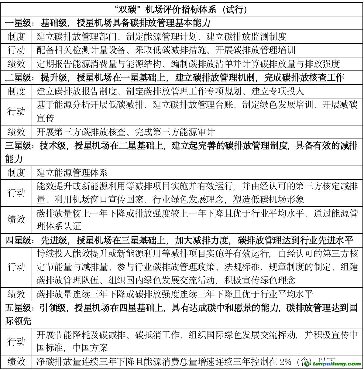 中國民用機場協(xié)會是中國民用機場行業(yè)(不含香港、澳門和臺灣)唯一的合法代表,于2022年6月發(fā)布了我國首份《“雙碳機場”評價指標體系(試行)》,是我國行業(yè)組織綠色機場評價體系自發(fā)進行的一次里程碑式實踐,該指標體系按照“制度、行動、績效”三個維度對機場進行指標評價,并將機場從低到高分為五種星級(見表14)。 本+文+內.容.來.自:中`國`碳`排*放*交*易^網(wǎng) t a np ai fan g.com