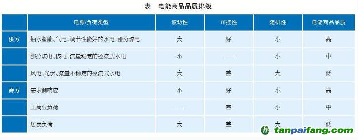 由于電能難以大量儲存,發(fā)用功率需要實時平衡,從對電力系統(tǒng)調(diào)度運行和功率平衡的影響,筆者認(rèn)為電能商品品質(zhì)應(yīng)從(波動性、可控性、隨機(jī)性)3個維度進(jìn)行衡量(見表)。其中波動性指功率相對于自身容量的變化幅度;可控性指將功率在一定范圍內(nèi)自由調(diào)節(jié)的難易程度;隨機(jī)性與可控性有一定的關(guān)聯(lián),隨機(jī)性大的電源或負(fù)荷一定難于控制,而隨機(jī)性小的電源或負(fù)荷可能易控(可靈活調(diào)節(jié)的資源),也可能難控(功率相對固定的資源)。對當(dāng)前各類常見供方(電廠)所生產(chǎn)和需方(負(fù)荷)所消費的電能商品品質(zhì)可以給出表中所示的排級。注意這里是對電能商品的品質(zhì)進(jìn)行排級,而非給電源或負(fù)荷“貼標(biāo)簽”,僅按一般情況依照電能商品品質(zhì)高低對電源和負(fù)荷進(jìn)行大致分類,而具體情況需要具體分析。例如,如果品質(zhì)一般的煤電經(jīng)過靈活性改造,可升級為高品質(zhì)的調(diào)峰電源。需要說明的是,電能商品品質(zhì)是從保證電力系統(tǒng)發(fā)用功率平衡的角度來定義的,因此對于電能商品的供方(生產(chǎn)者)和需方(消費者),商品品質(zhì)的價值內(nèi)涵是不同的。從定價原則來講,對于供方,電能商品品質(zhì)越高,定價越高;對于需方,電能商品品質(zhì)越高,定價越低(即價格越優(yōu)惠),甚至可以享受負(fù)電價。也就是說,供方所生產(chǎn)的低品質(zhì)電能商品(如風(fēng)電)可以較低價提供需方的高品質(zhì)電能商品消費(如需求側(cè)響應(yīng)),反之亦然。